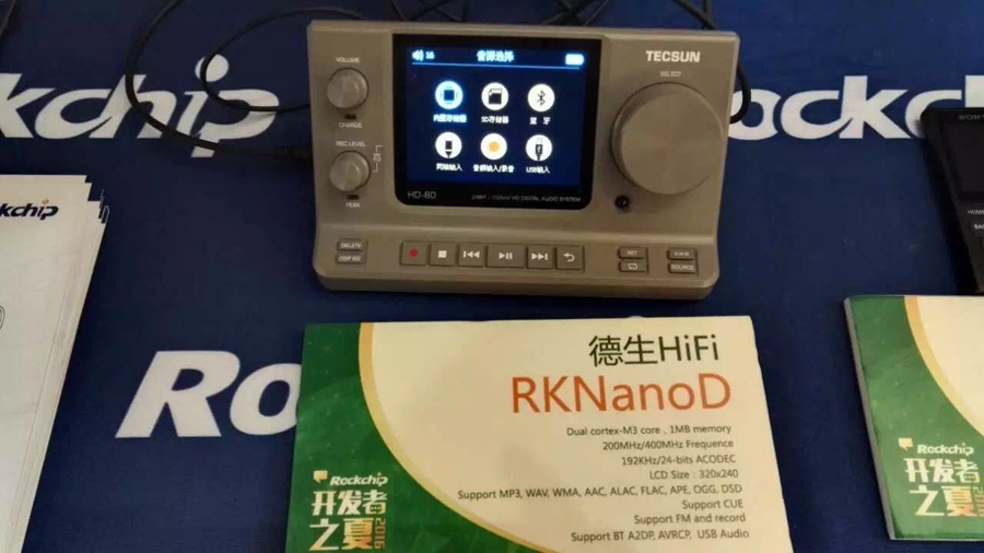 現(xiàn)場展示了多款搭載RKNanoD的音響設(shè)備,具備七大特點:好聲音(>100dB SNR)、真HiFi(24bit 192Khz)、低功耗(8mA MP3播放)、高性能雙核M3、大容量1MB SRAM、無線連接、FreeRTOS。