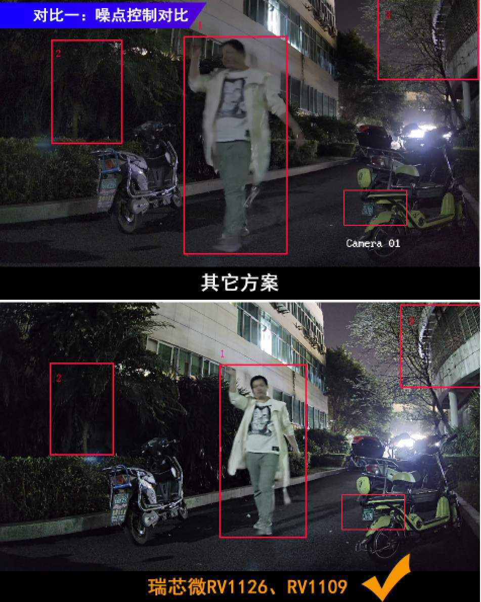 基于RV1126及RV1109方案的多級降噪、3幀HDR、銳度&對比度、Smart AE智能自動曝光、AWB白平衡及畸變校正這六個技術(shù)特點(diǎn),在不同場景下的表現(xiàn)均有明顯的優(yōu)勢。