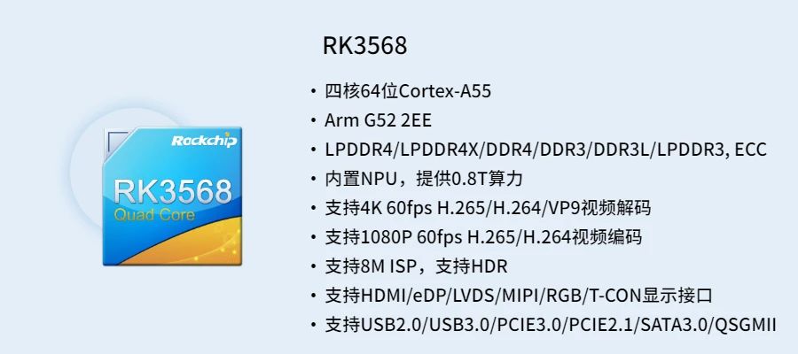 RK3568芯片是瑞芯微全新推出的新一代AIoT計(jì)算平臺,除具有高性能CPU和GPU外,還搭載第三代AI處理器,有效滿足智慧視覺、工控、物聯(lián)網(wǎng)網(wǎng)關(guān)應(yīng)用的性能需求。其具備五大技術(shù)特性: