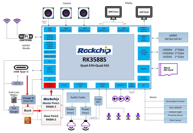 RK3588S同樣配備RK806-2雙PMIC的供電方案;存儲采用 LPDDR4X、eMMC、SD3.0;擁有 eDP TX、MIPI D/C PHY TX、MIPI D/C PHY RX、MIPI DPHY RX、PCIe20、TYPEC、音頻輸出、陣列MIC輸入等外設(shè)接口。