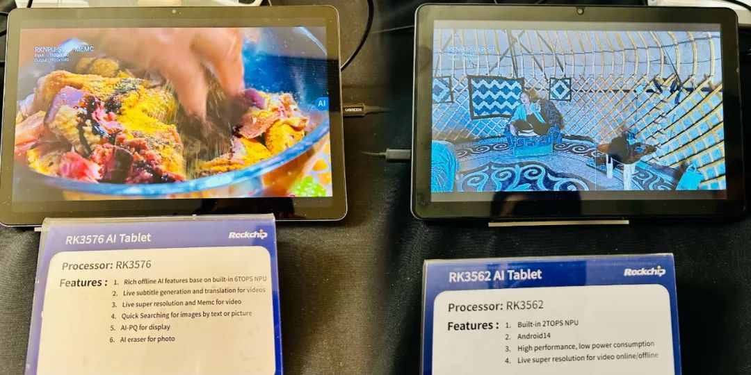 在消費(fèi)電子展區(qū),展出了多款AI平板,分別采用RK3588S、RK3576、RK3562,支持AI-PQ/MEMC/SR及實(shí)時(shí)字幕展示和翻譯。RK3588S AI平板是目前國內(nèi)極為熱門的智能教育產(chǎn)品,集學(xué)習(xí)機(jī)、平板電腦及PC三合一,內(nèi)置有道AI助手 "Hi Echo" ,對教育模式產(chǎn)生顛覆式影響,大大提高教學(xué)效果及學(xué)習(xí)效率。