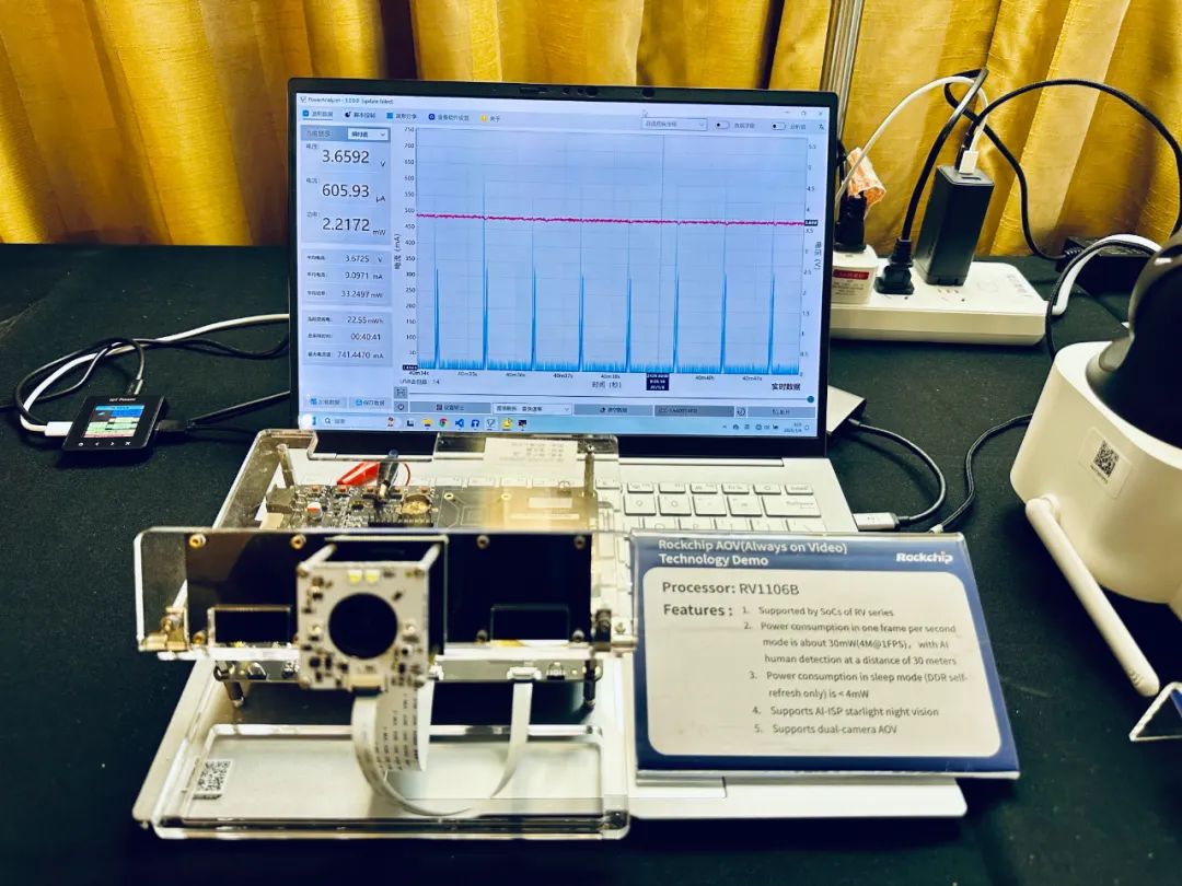 機(jī)器視覺展區(qū),展示了基于瑞芯微多款視覺方案的豐富產(chǎn)品形態(tài),包括4K60運(yùn)動DV、AI智能視覺眼鏡、雙目AOV IPC、雙目可視門鈴、打獵機(jī)、醫(yī)用內(nèi)窺鏡等,廣泛應(yīng)用在安防、娛樂、教育辦公、醫(yī)療等場景。展品采用RV1106B系列及RK3576,重點(diǎn)演示了瑞芯微AOV超低功耗及新一代AI-ISP技術(shù),支持一秒一幀或者一秒多幀低幀率全時(shí)錄像,極低功耗運(yùn)行;以及暗夜拍攝效果畫面亮度及色彩還原度效果更好。